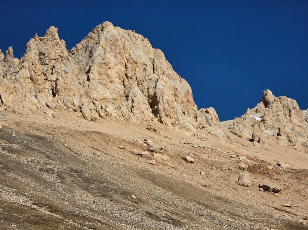 From the lakes, it’s another 1½ hours of tough climbing to reach Leila-Kul Pass. Not far beyond the lakes, the terrain shifts into a rock-strewn moonscape, with jagged, rugged peaks rising in every direction.