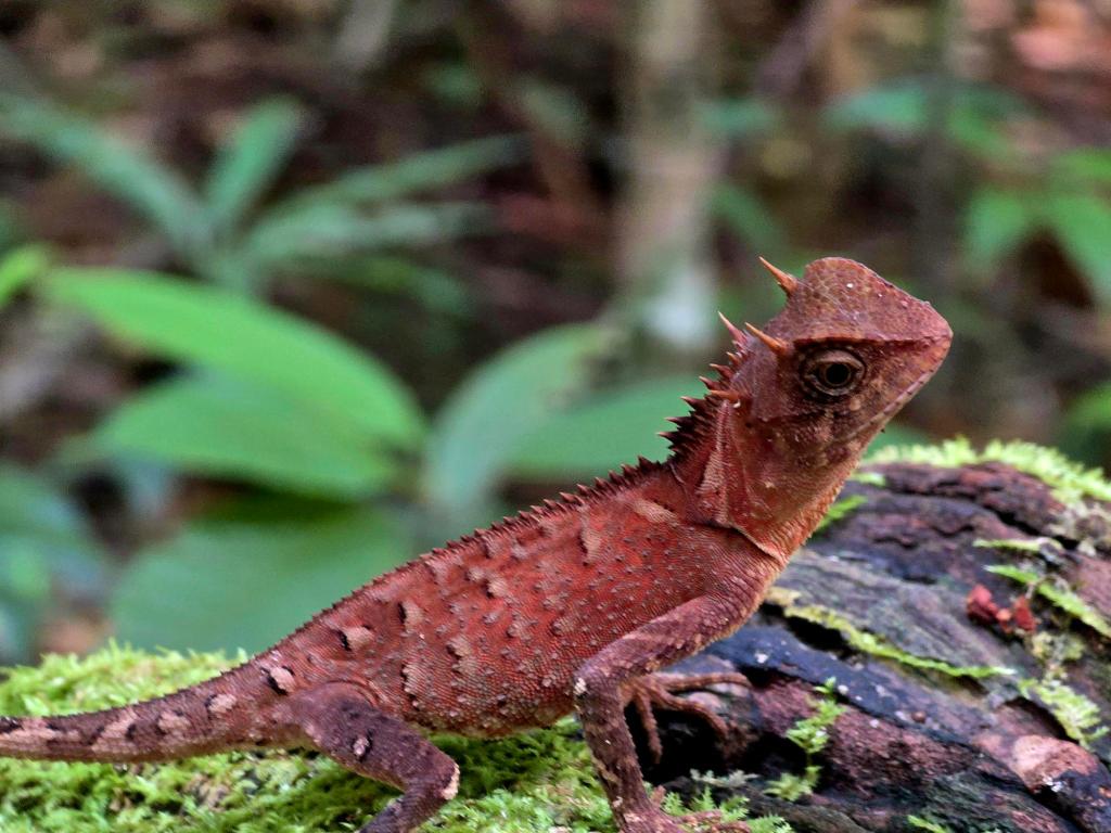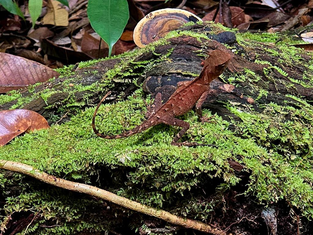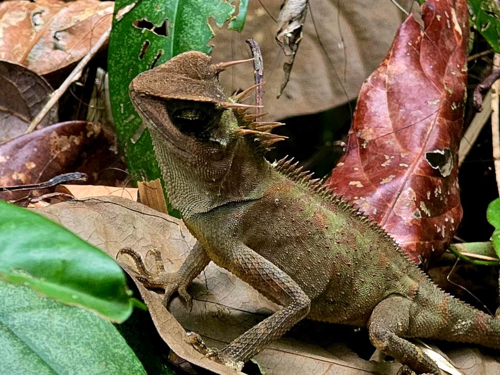 The trail climbs through dense southern Thai jungle, the kind where roots claw across the path, leaves drip from the last rain, and the air feels heavy enough to grab. Cicadas buzz nonstop, birds flash through the canopy, and every few minutes you’re stepping up rock staircases or threading between trees that look like they’ve been standing there forever. Sections of roots and parts of the few steep sections of wood stairs were a bit slippery, and part of the longest staircase was currently under repair. Overall, it’s well-maintained, but still very much a jungle trail. Horned agamas, or Mountain Horned Dragons, can be found all over the place. I’m not sure if the trail got its’ name due to their abundance, or because the mountain resembles a dragon’s head from a distance? It wasn’t the only cool reptile to be found. More Asian water monitors were seen on the lower sections of trail.