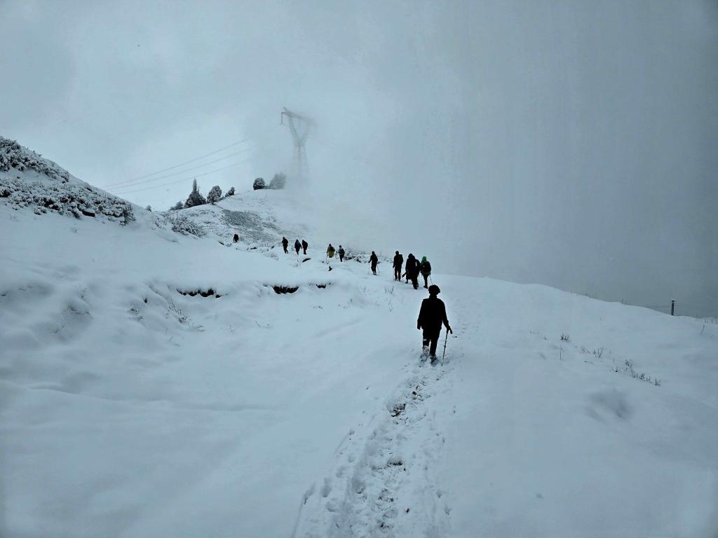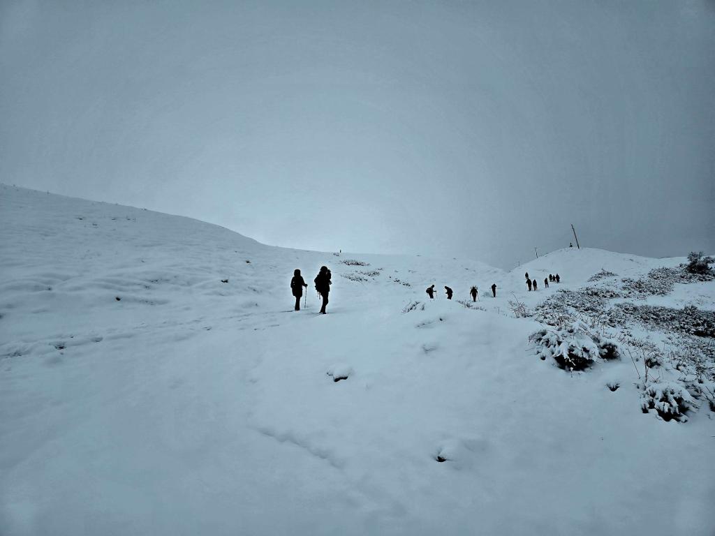 We’ve done this hike once in late summer and once in winter conditions. In winter, there was about a foot of snow on the ground, with steady snowfall coming and going. Visibility would open up in dramatic patches, then vanish again into whiteout conditions minutes later.