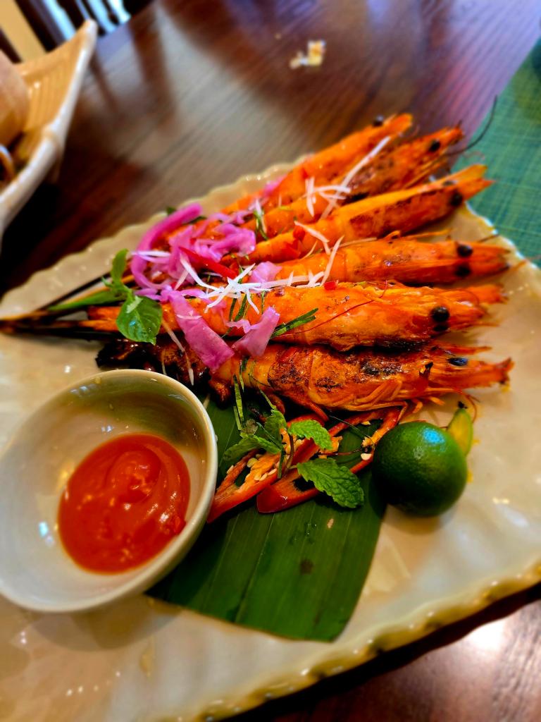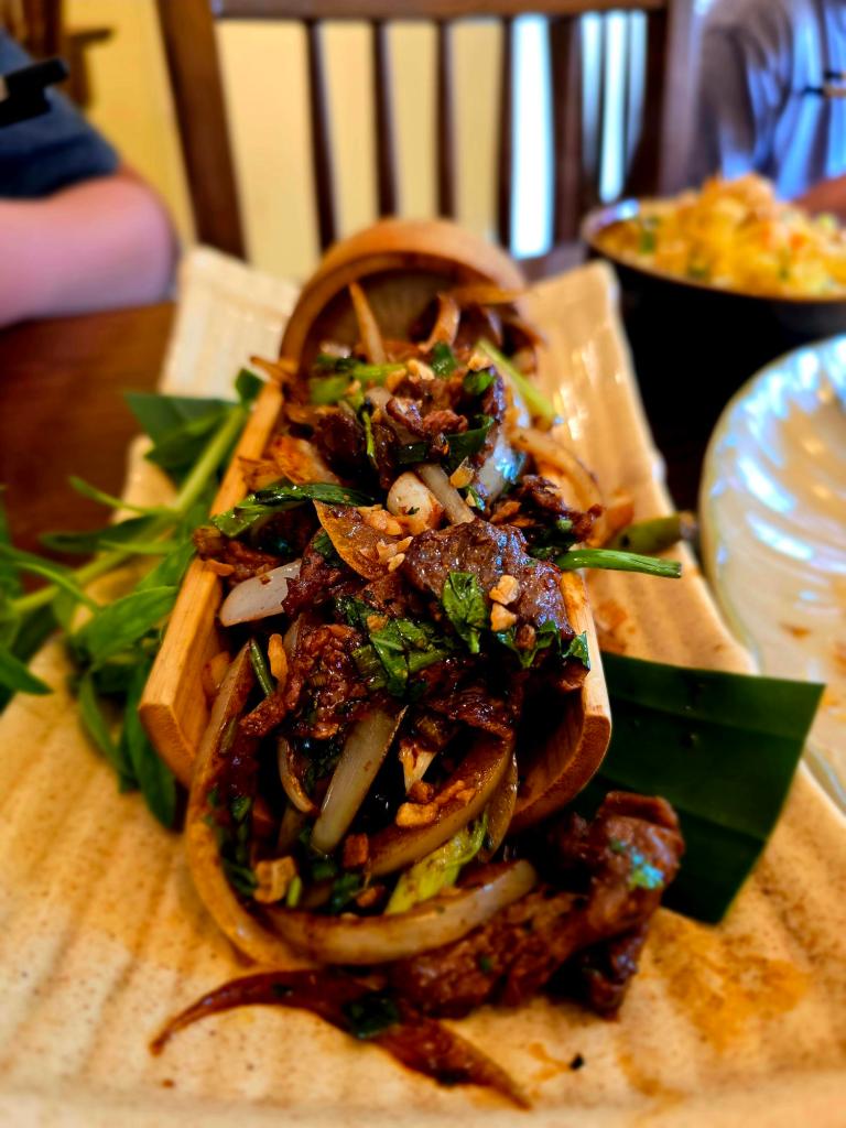 Vietnamese food rarely disappoints. You can walk into almost any restaurant, point at a few dishes, and know you’ll be well taken care of. Our first big lunch delivered plates of massive prawns and spicy twice-fried beef with herbs and chilis, served inside a split section of bamboo. Perfectly executed and beautifully presented. We ate constantly, stopping wherever something smelled good, and I was always hunting my next iced coffee.