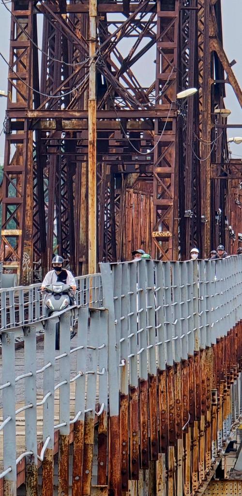 On our final morning, I was up before sunrise again, grabbing a strong iced coffee from a street cart before heading toward Long Biên Bridge. Built over 120 years ago, the steel cantilever bridge still carries trains while an endless stream of scooters and motorbikes buzz along its sides. Walking it was equal parts exhilarating and unnerving, scooters tearing past at speed as the structure rattled and hummed. Trains still occasionally thunder through the center, adding one last layer of spectacle.