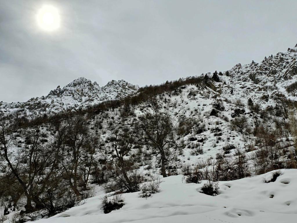 After passing the last house, we followed the river toward the base of the climb at a steady, manageable incline. The closer we got to where the slope steepened, the deeper the snow became. We stopped for a snack at the base of the climb, then set off hoping to reach the ridgeline, where the mountains stretch away in every direction. The snow had other ideas. By the second long switchback, it was already knee-deep on me and even higher on Rowan. I had him fall back so several people could break trail ahead of him, and we pushed on a bit farther before emerging onto a small perch with a clear view back down the valley. That was as far as ambition carried us that day. Lunch came out, spirits stayed high, and the mountains were more than enough without demanding a summit.