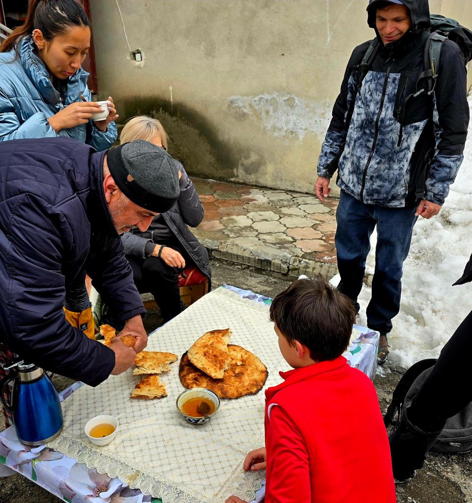 We slow-walked back into Khushori, boots wet and legs tired, when a gate swung open and a man stepped out with a warm smile and easy greetings. He invited our group into his courtyard, where we learned the family were beekeepers. Snow-capped bee boxes lined the yard, and before long fresh flatbread appeared, followed by bowls of pure, unfiltered mountain honey.