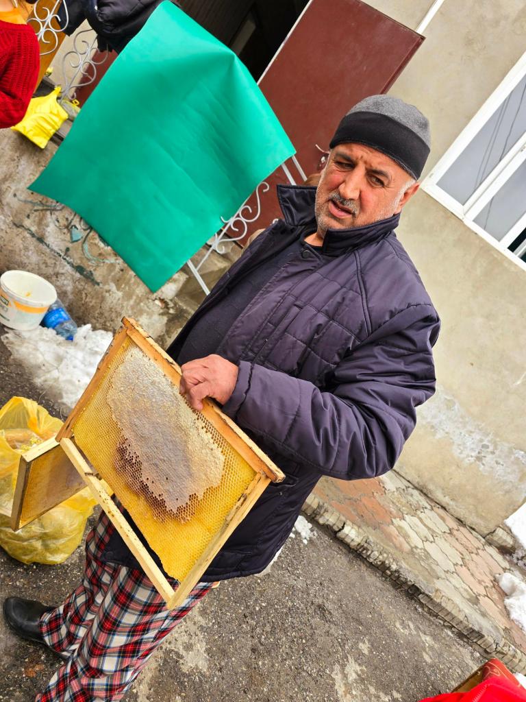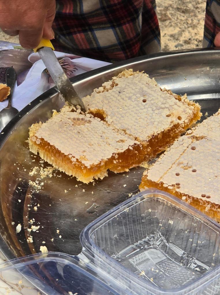 The first round of bread disappeared quickly, each torn piece buried under generous drizzles of honey. Then came a second round, and the process repeated itself without hesitation. Central Asian honey is hard to describe properly—rich, floral, and impossibly smooth—but it didn’t take long for all of us to start quietly calculating how many jars we could afford with the cash in our pockets. As those calculations were underway, the family patriarch returned holding a large rectangular honeycomb. He broke off bite-sized pieces and passed them around, smiling as we stood there chewing, sticky-fingered and happy.