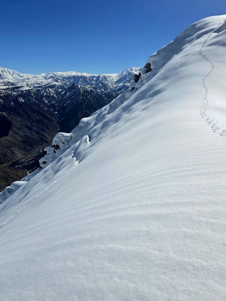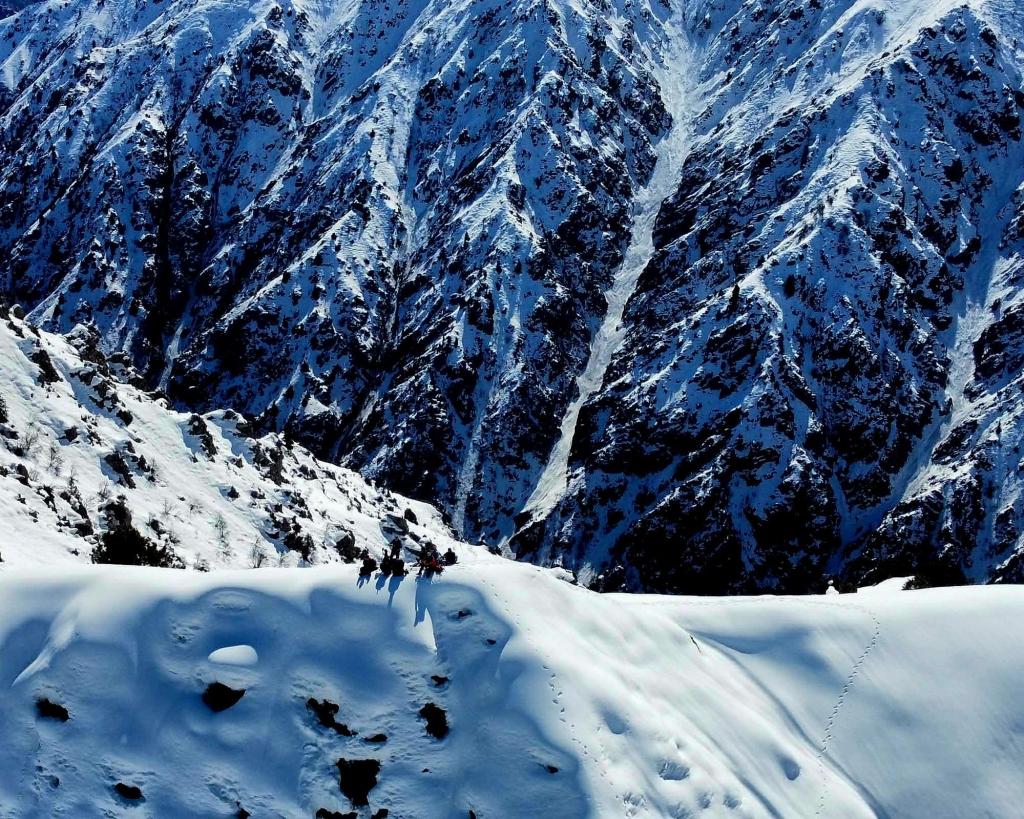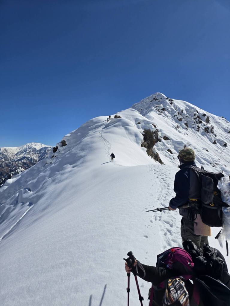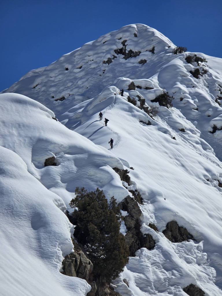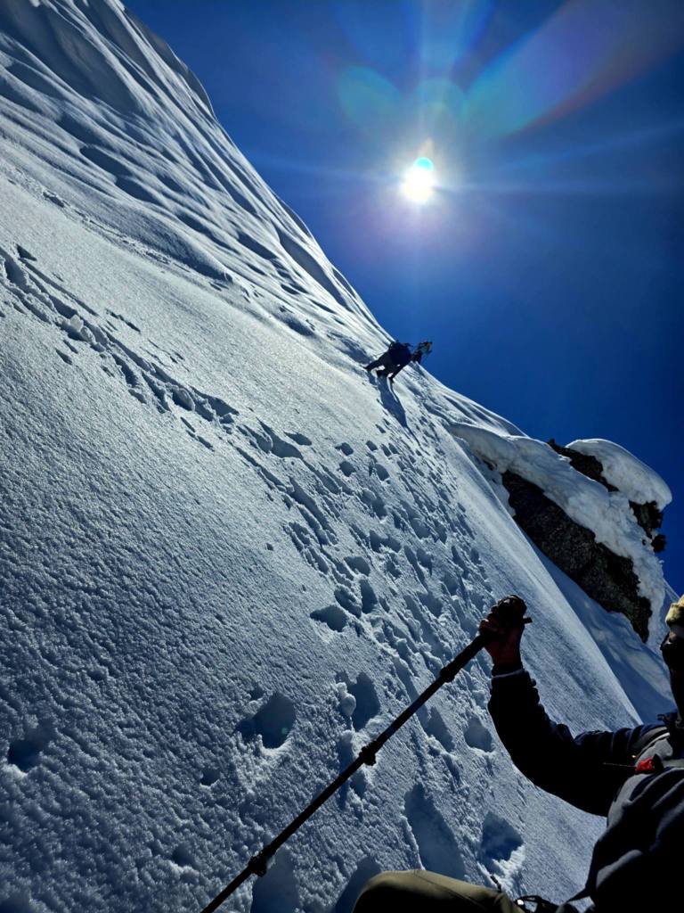 After cutting across a gentle slope for a few hundred meters, the terrain suddenly went vertical. We began kicking footholds into the snow, moving slowly and deliberately. Somewhere halfway up, my vertigo decided to rejoin the conversation, and I made a conscious effort not to look back down the slope.