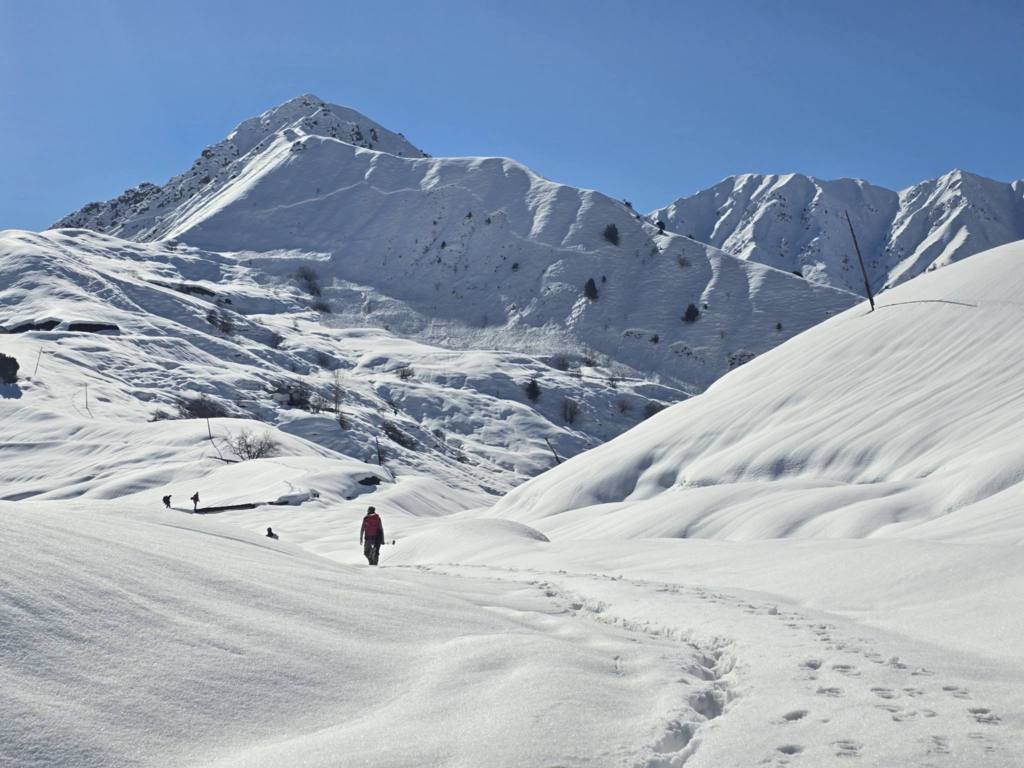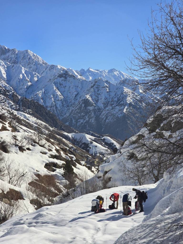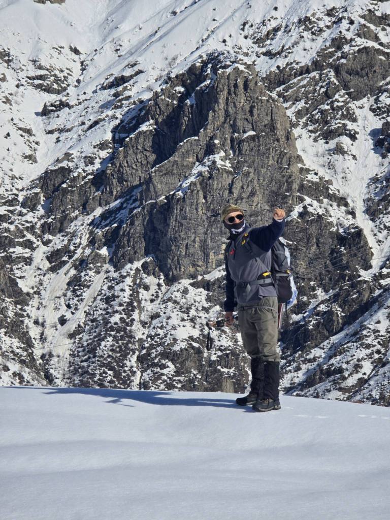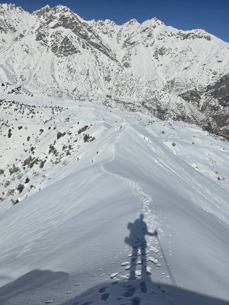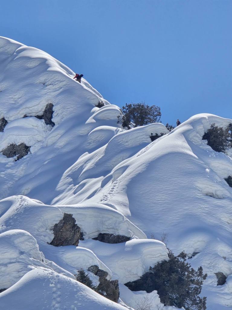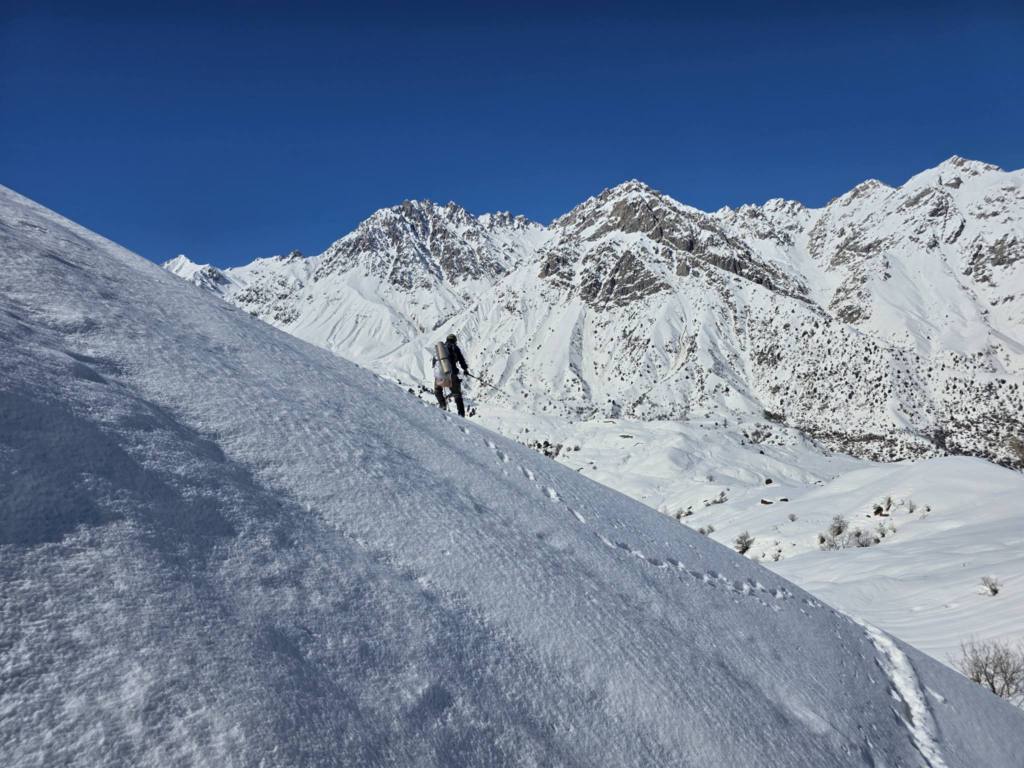 After cutting across a gentle slope for a few hundred meters, the terrain suddenly went vertical. We began kicking footholds into the snow, moving slowly and deliberately. Somewhere halfway up, my vertigo decided to rejoin the conversation, and I made a conscious effort not to look back down the slope.