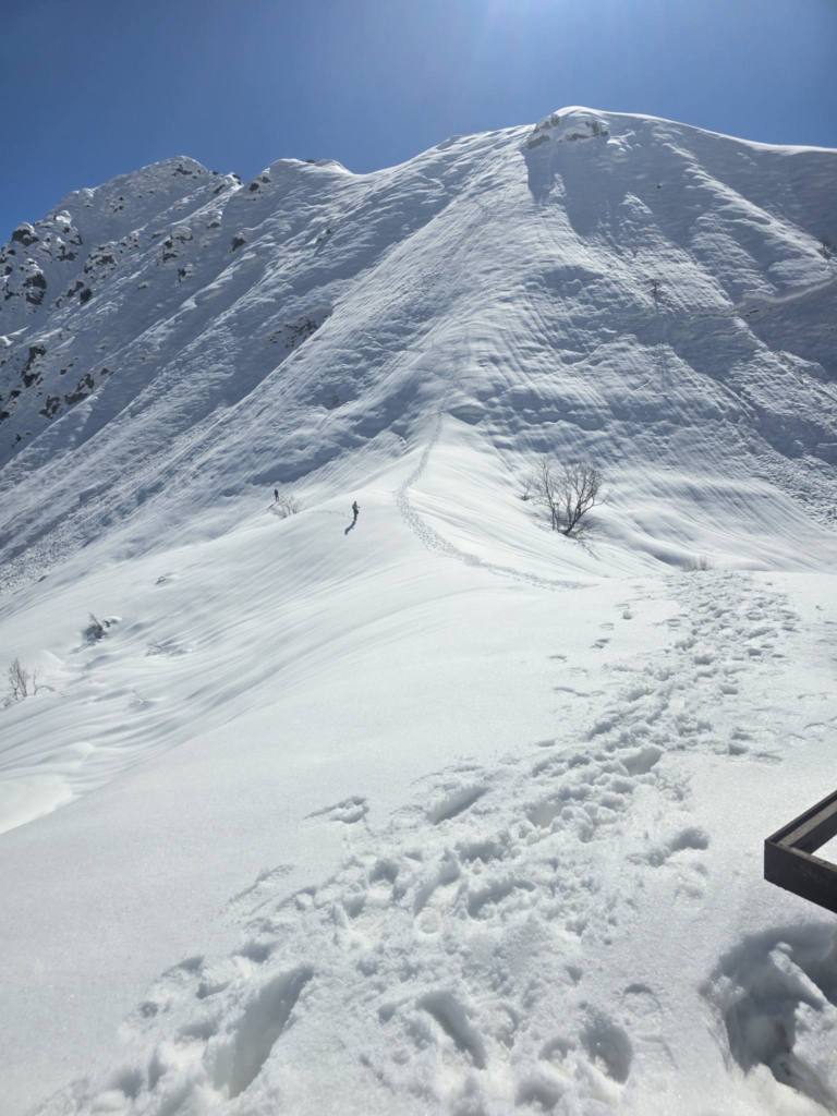 From my perch, I was able to get photos and aerial footage of the final push to the summit. I briefly considered scouting an alternate line around the slab, but the options weren’t appealing — either cross the snow slab or drop into a very steep slope high above the valley floor and try climbing back up on the other side. Staying put felt like the right call for me at that moment.