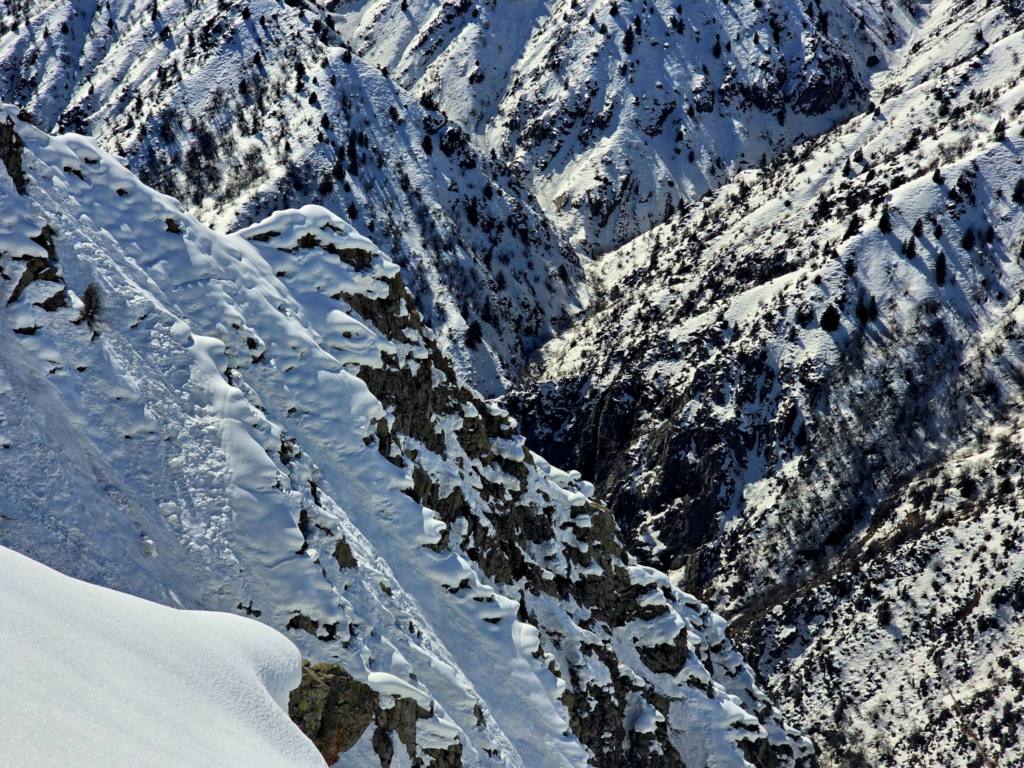 Just around the corner, we could see where an entire section of mountainside had broken off and slid to the valley floor below. That visual paired nicely with the vertigo. A little higher up, a soft section of snow collapsed under me, dropping away to the ledge I was standing on. I had trouble getting over it and ended up zig-zagging around, carving side holds and working my way carefully upward.