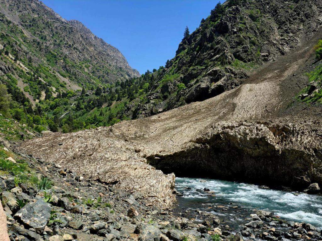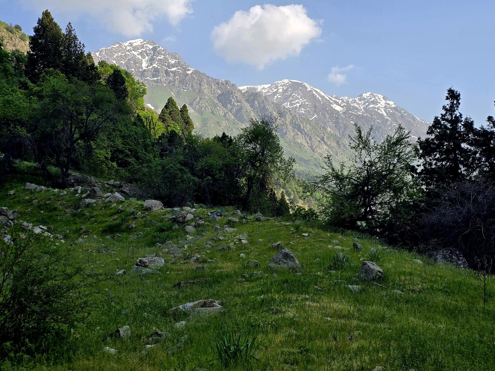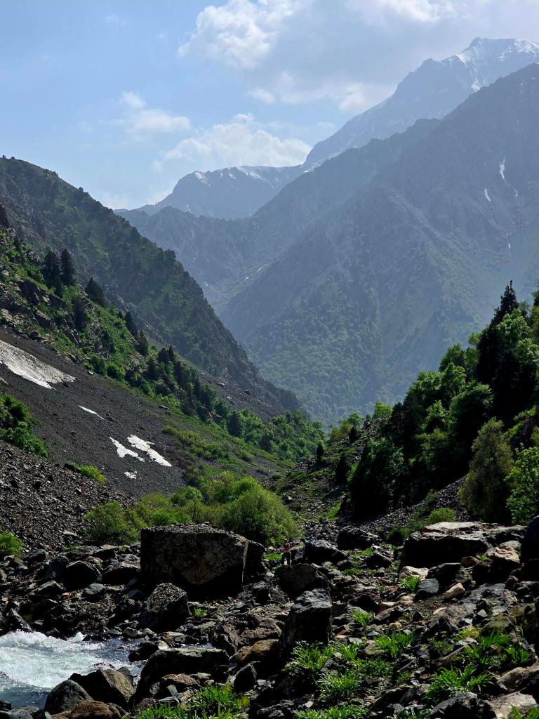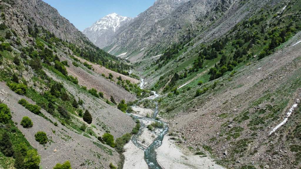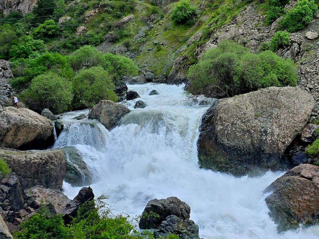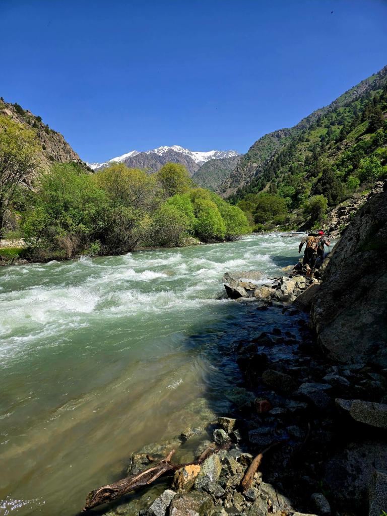 Early May is a beautiful time to be in the Qaratoqh River valley. Snowmelt from the high peaks sends water rushing through every channel. The main river runs strong and loud, while countless smaller tributaries pour down from the surrounding slopes. Everything was bright green from the spring growth, while the higher peaks behind the closer ridges were still showing patches of lingering snow.