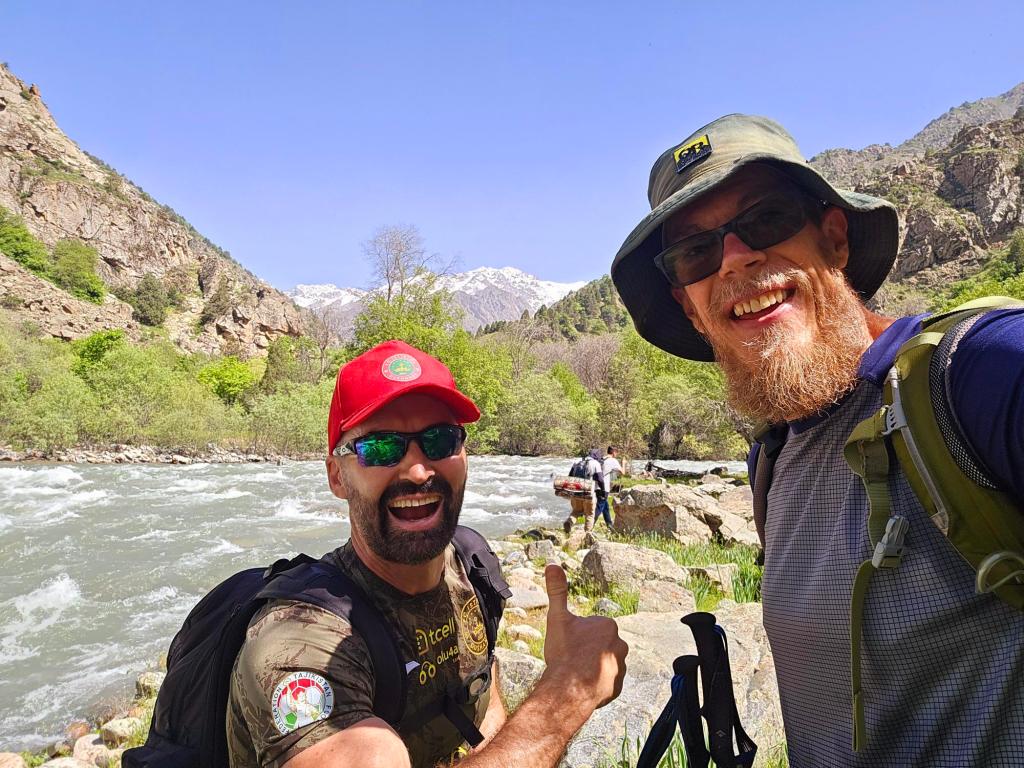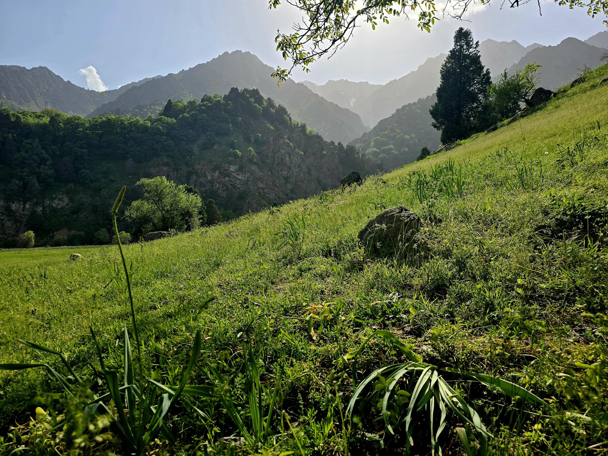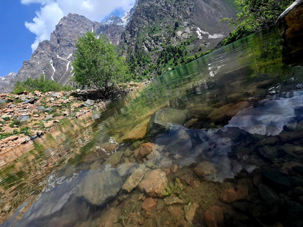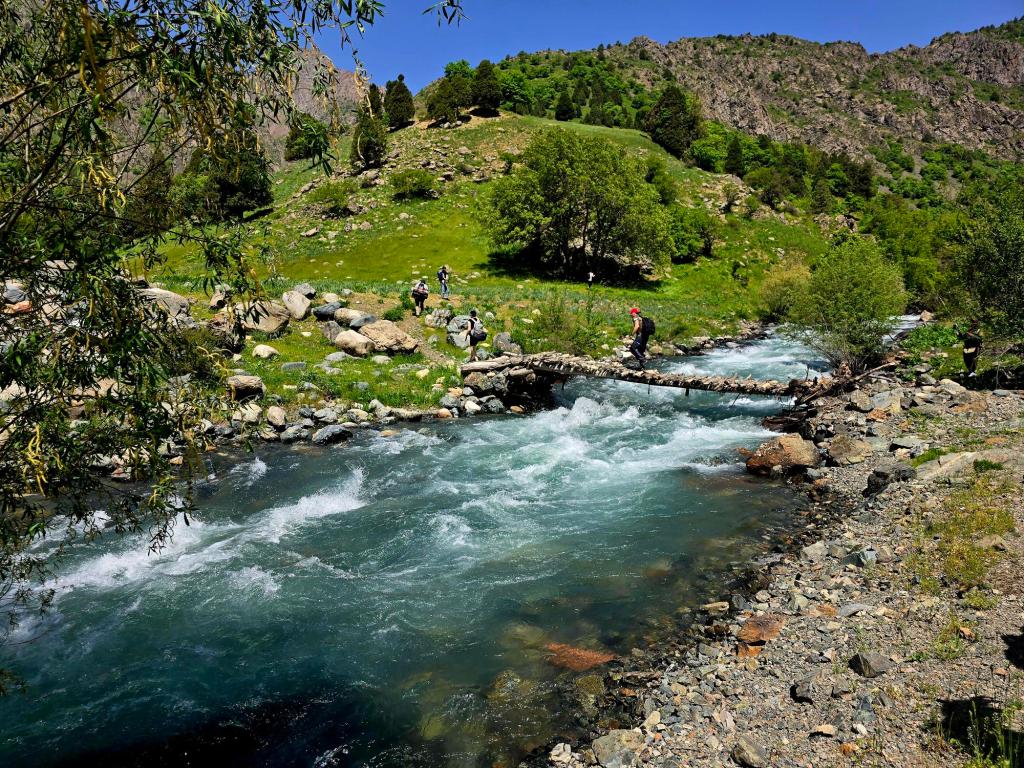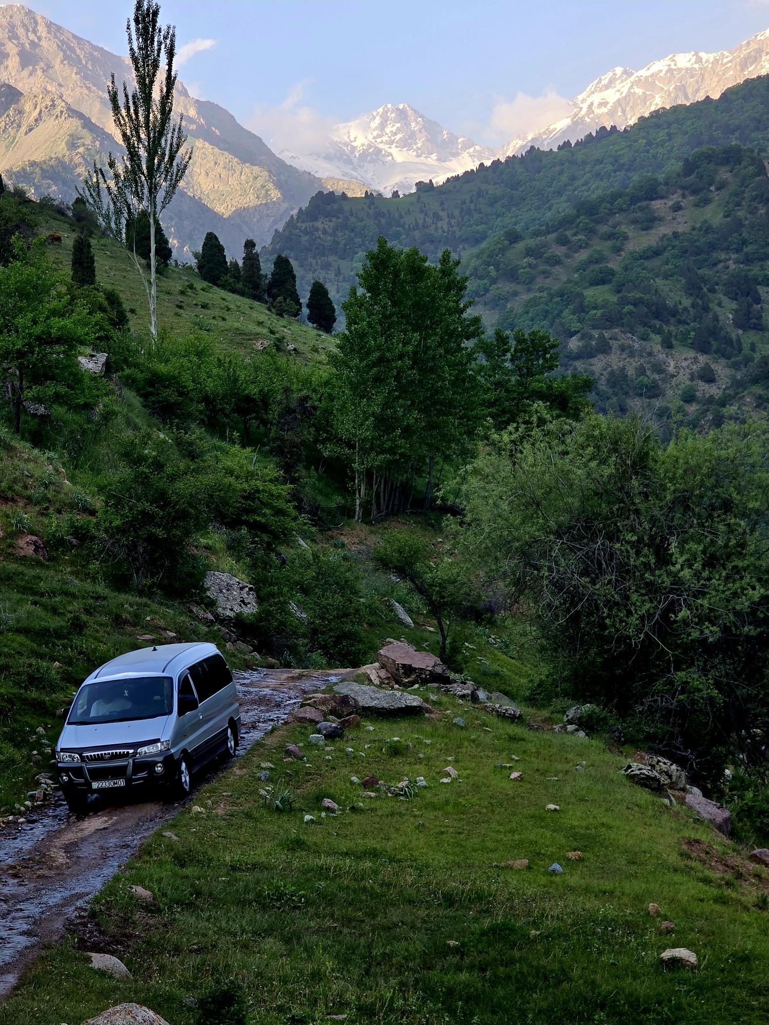 Early May is a beautiful time to be in the Qaratoqh River valley. Snowmelt from the high peaks sends water rushing through every channel. The main river runs strong and loud, while countless smaller tributaries pour down from the surrounding slopes. Everything was bright green from the spring growth, while the higher peaks behind the closer ridges were still showing patches of lingering snow.