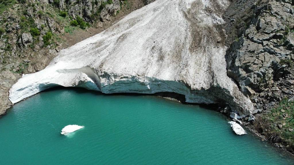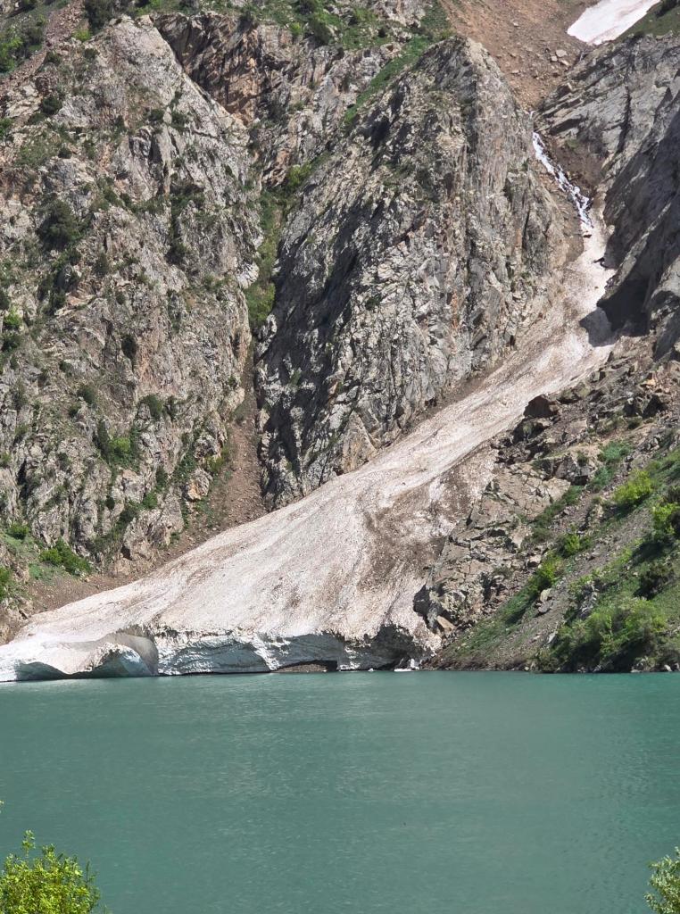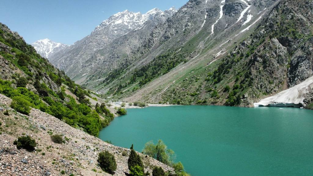 Like many lakes in Tajikistan’s Hissar Range, Lake Payron appears to be a landslide-dammed lake. At some point in the past, a massive rockslide crashed down from the steep valley walls and blocked the narrow Payron River valley. Instead of flowing freely downstream, the water pooled behind this natural barrier of boulders and debris, gradually forming the lake that sits there today.
