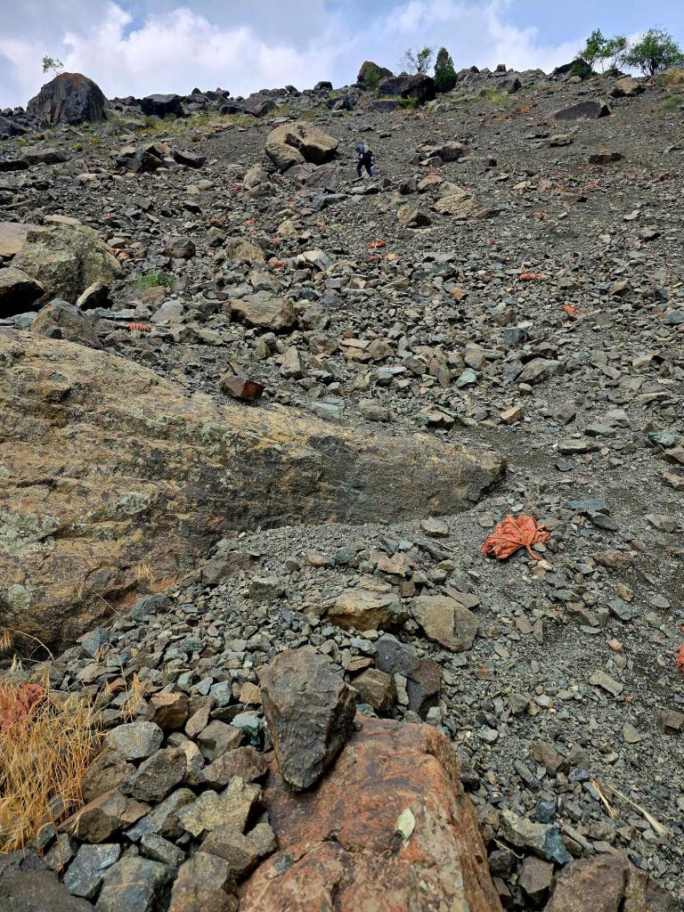 We began the slow, grinding climb up loose scree, picking our way between large, truck-sized boulders, each step sliding back just enough to remind you how much work it was going to take. It was one of those climbs where you stop often—not because you want to, but because you have to.