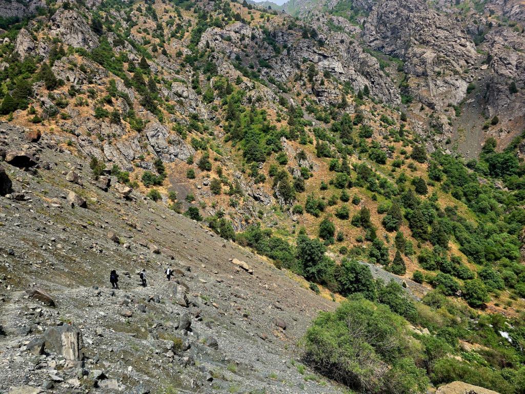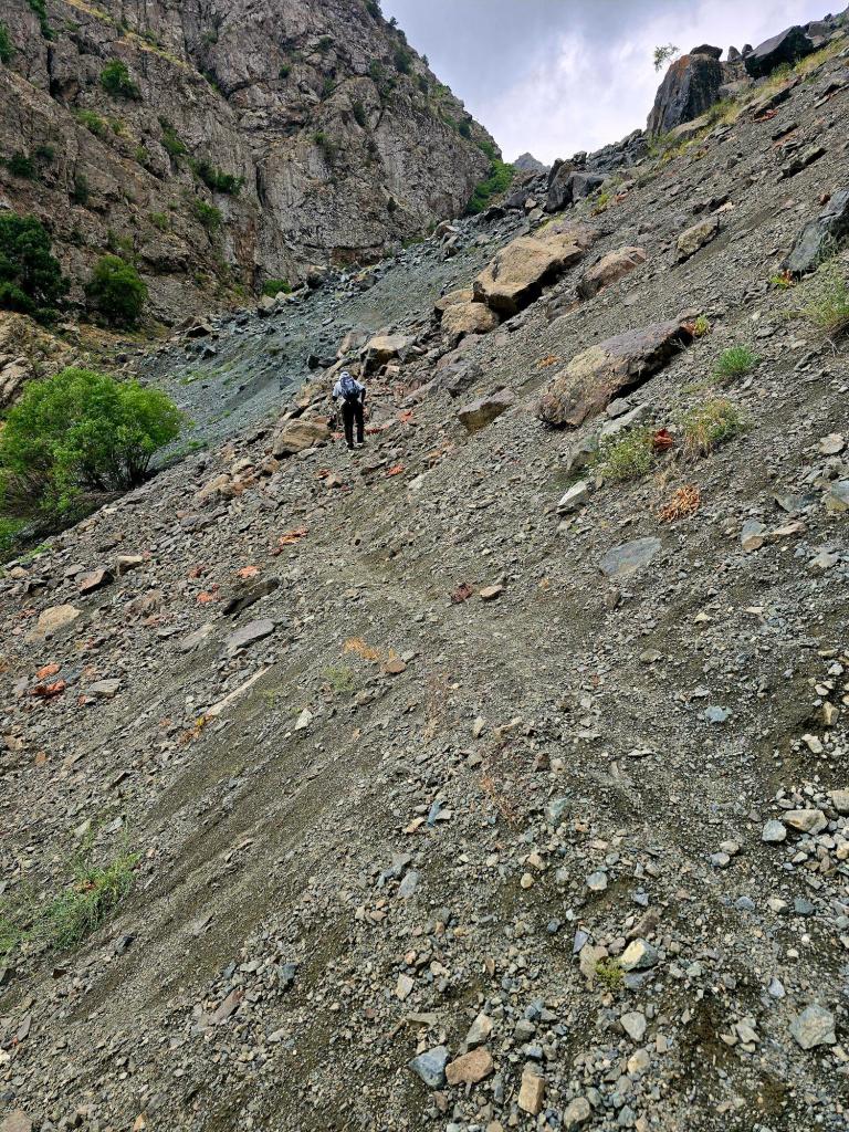 Eventually, the canyon ended in what looked like a dead end—a steep wall of rock and scree rising sharply above us. But off to one side, a narrow line hinted at a way up to a higher shelf.
