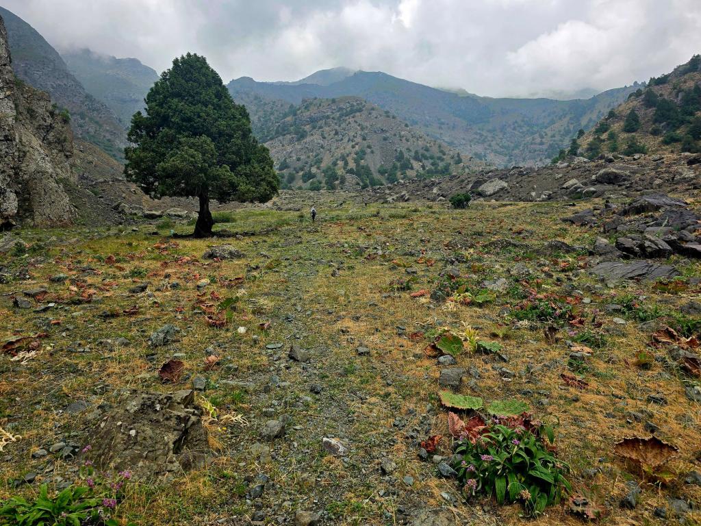 A massive cirque stretched out before us, with a lone tree standing oddly out of place in the rocky grassland. We walked another half kilometer across the basin, and then—almost out of nowhere—the lake appeared, rising into view over a small mound, framed in wildflowers.