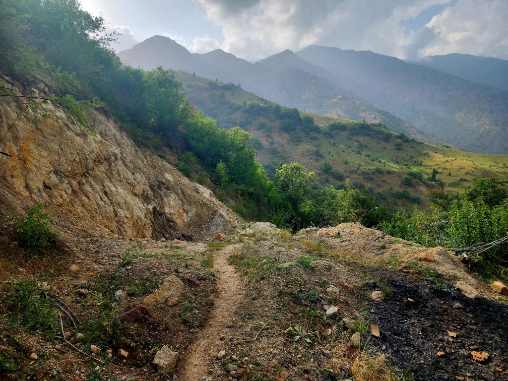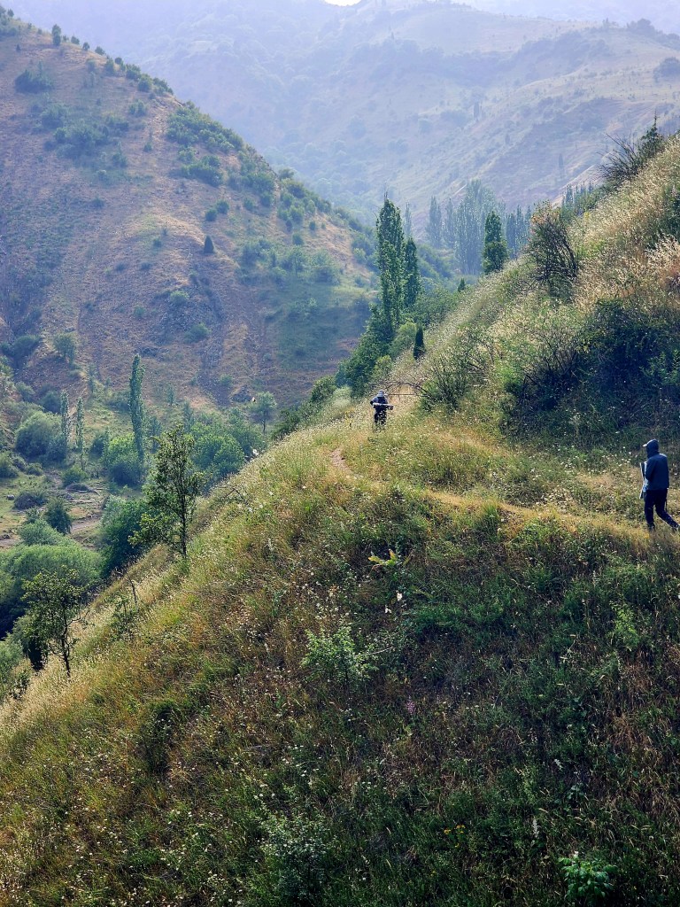 We started walking up the road, skirting the mud by cutting through patches of grass where we could, eventually having to chase an angry bull off the track with a few well-placed sticks. Just another small detail added to the day. After a while, the road flattened out, and in the distance we spotted a faint trail dropping steeply into the valley below.