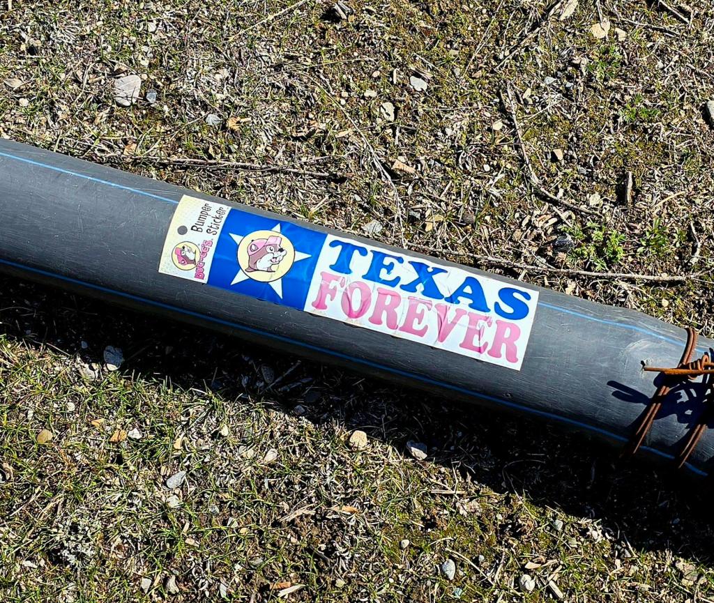 A few miles in, we came across fresh, oversized bear tracks pressed into the soft ground. Big enough to stop you for a second. We both crouched down to look, tracing the shape, the depth, imagining something moving through here not long before us. Not far past that, something else caught my eye—a Buc-ee’s “Texas Forever” bumper sticker stuck to a water pipe. Completely out of place. I half expected to round the next bend and see a billboard promising brisket and beaver nuggets just up the road.