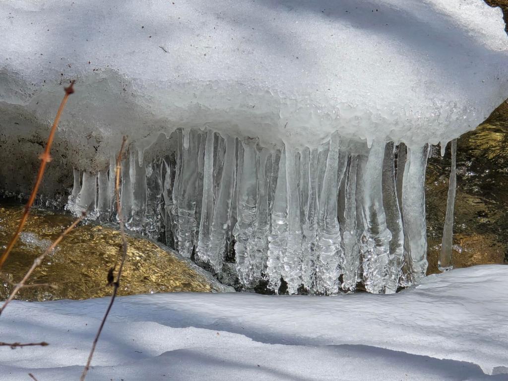 In the shaded stretches, winter hadn’t loosened its hold. Thick shelves of snow and ice lined the riverbanks, with long, dripping formations hanging beneath them like frozen tentacles. My daughter stopped more than once to study them, poking at the edges, watching the steady drip, that simple kind of curiosity that slows a hike down in all the right ways.