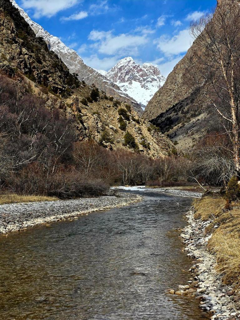 Late March still had a firm grip on the upper slopes. Snow clung to the higher ground, and the river, fed only lightly at this time of year, moved steadily but without urgency. Three distinct peaks stood at the far end of the valley, white and distant, pulling the eye forward in a way that made the miles feel smaller than they were.
