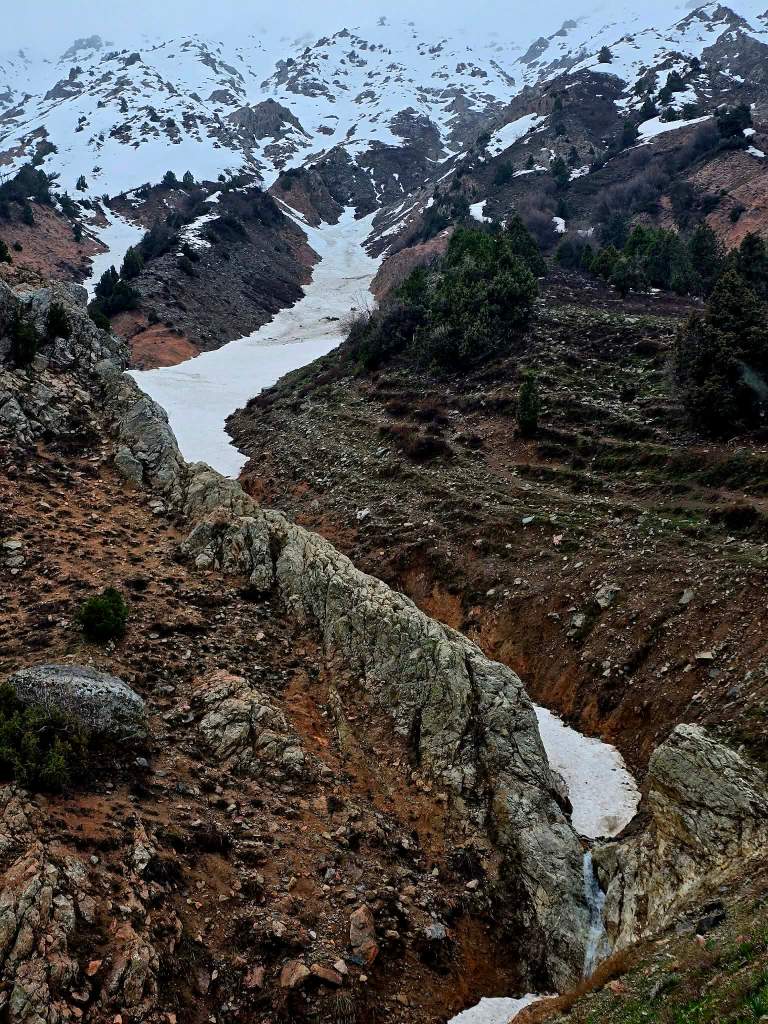 We worked our way up past a series of gorges, some still choked with avalanche debris. One in particular had long snow bridges stretched across it, with water occasionally bursting out into short waterfalls before disappearing back under the snowpack. It was a reminder that things were still very much in transition up here.