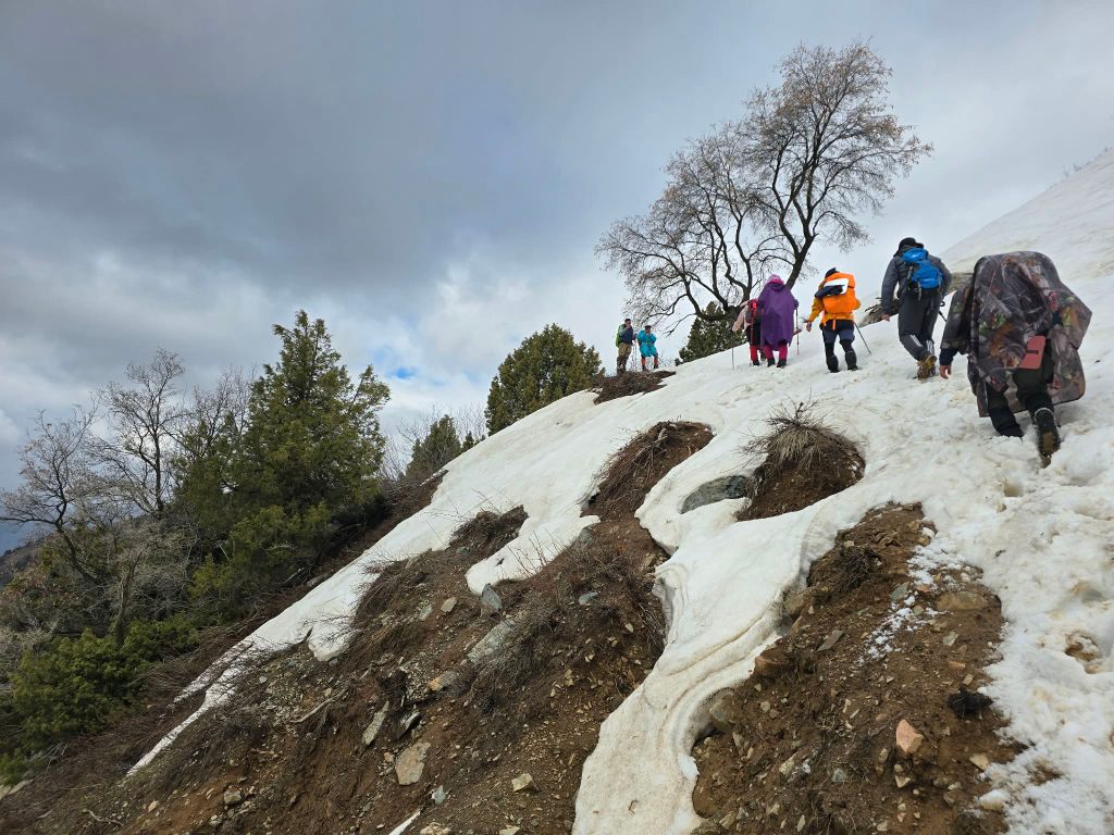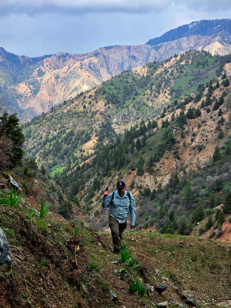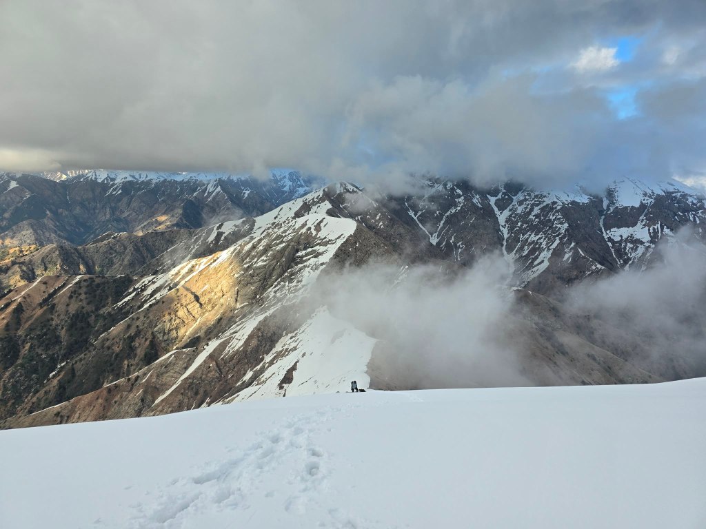 When we finally crested the ridge, the view into the opposite valley hit just as hard. Below us, mountains dropped away toward the edge of the city, with Mushteppa Peak sitting prominently in the center of it all. We had been on that ridge just weeks before, turning back short of the summit. Now we were staring at it from the other side.