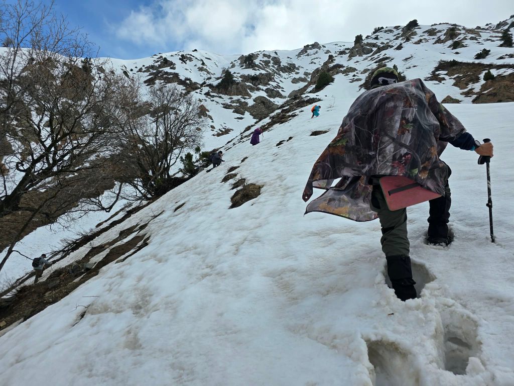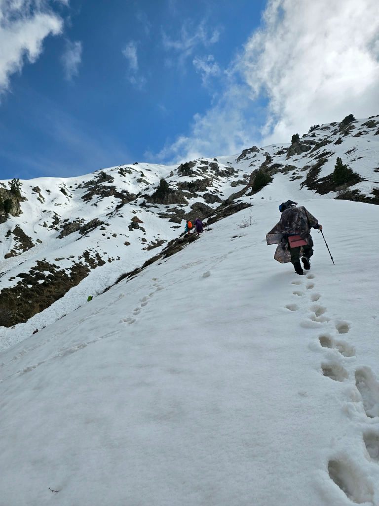 We passed the last of the river crossings and pushed toward the base of the mountains. A couple of shepherd camps were being set up for the season, and we stopped to ask about conditions over the peak. The response was mostly confusion and a few gestures toward the snow-covered slopes above us—as if to say, “You see that, right?”