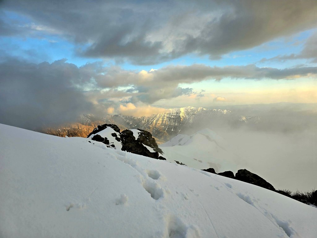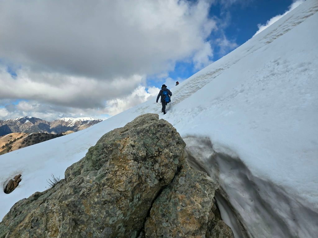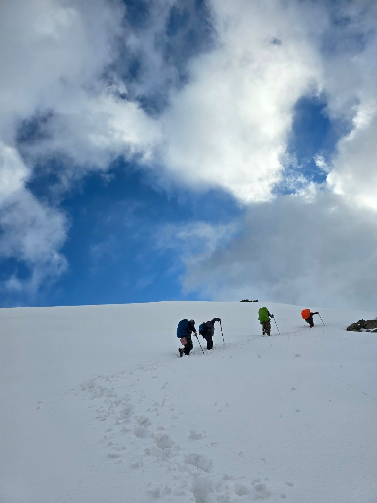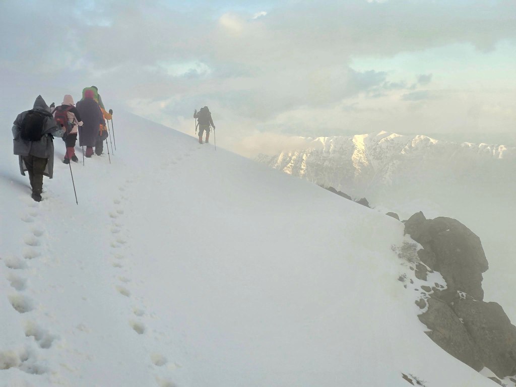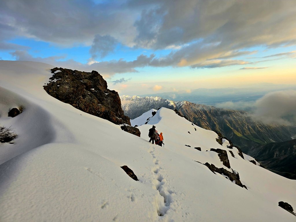 The next section was a grind—mud, rock, and deep snow bridges mixed together. Eventually, we reached the slope leading up to the ridge. It was steep and fully snow-covered. Sirius took the lead, kicking in steps, turning it into something like a staircase to the sky. Every now and then a foot would punch through into a hole beneath, but not enough to slow us too much.