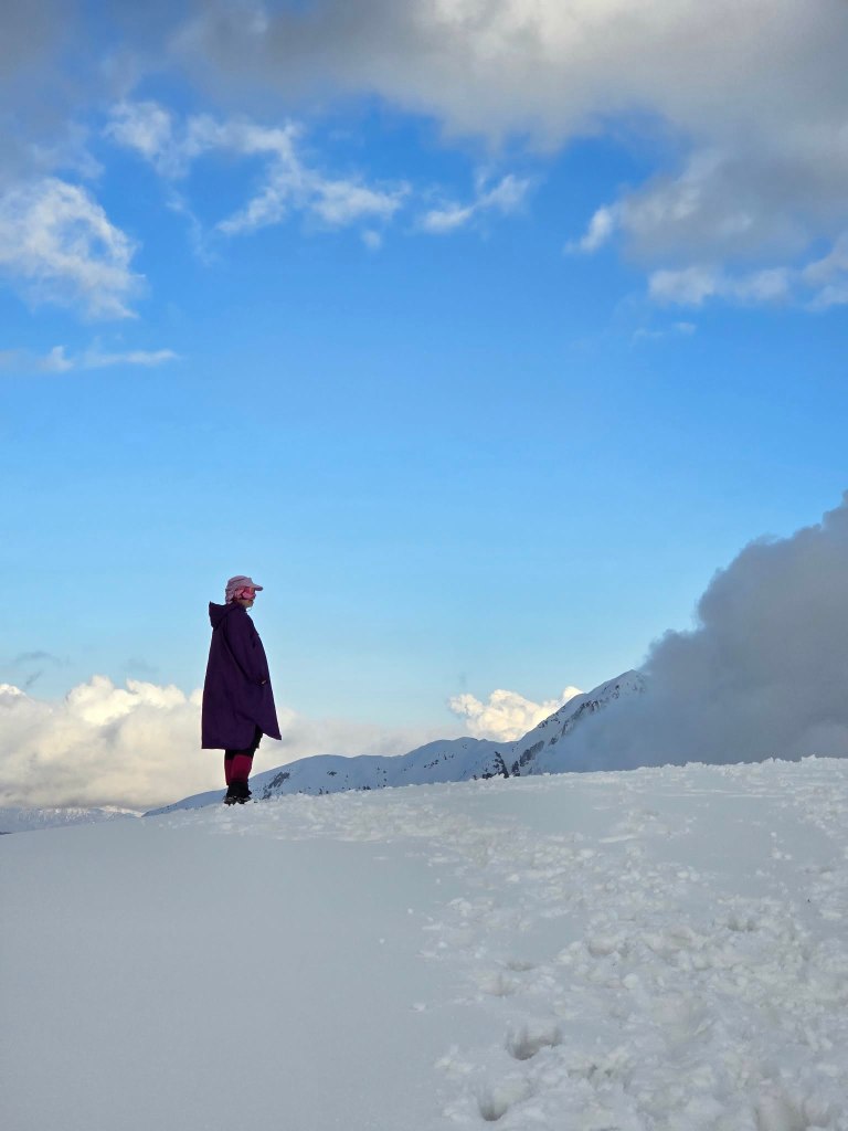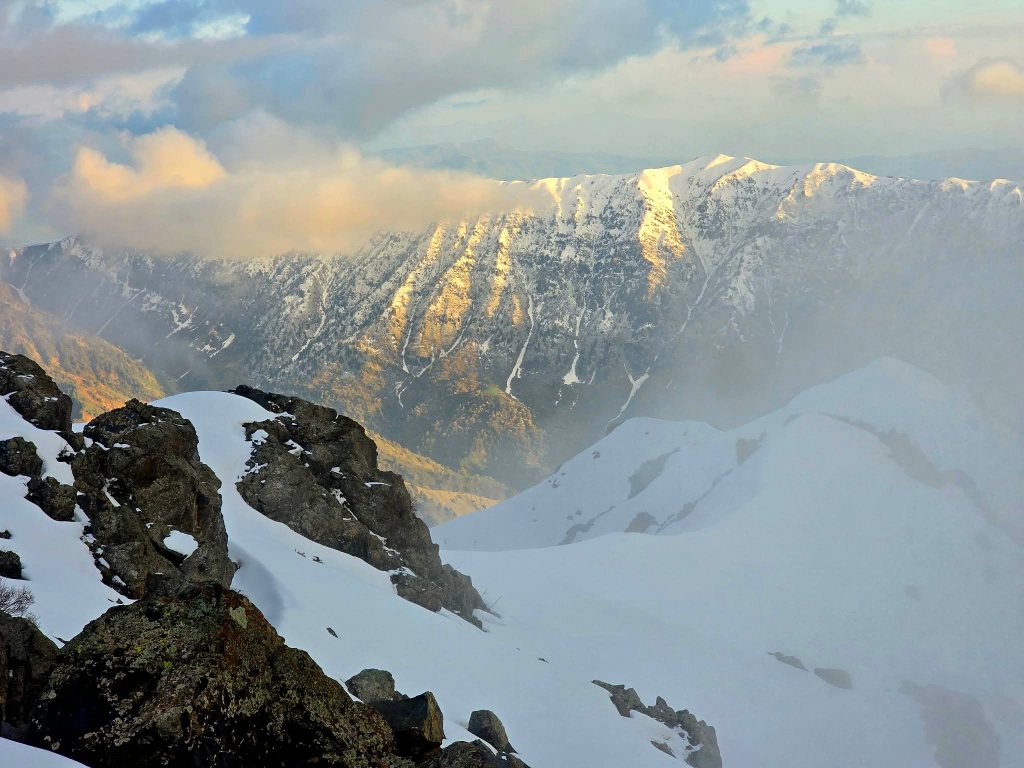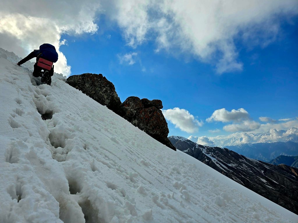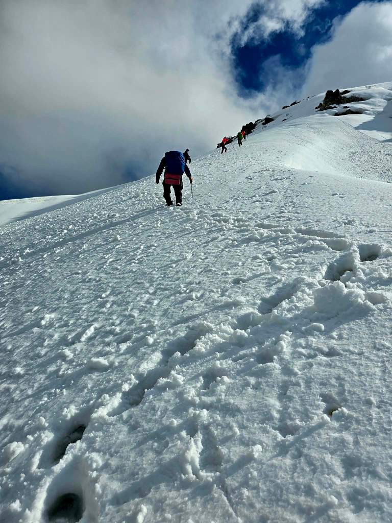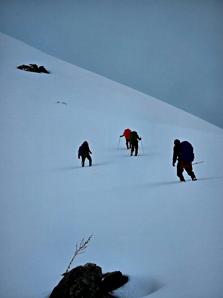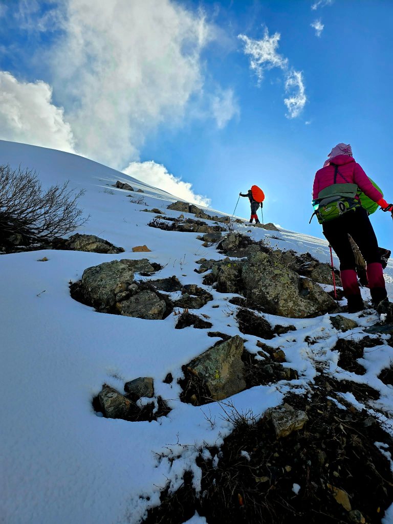 The next section was a grind—mud, rock, and deep snow bridges mixed together. Eventually, we reached the slope leading up to the ridge. It was steep and fully snow-covered. Sirius took the lead, kicking in steps, turning it into something like a staircase to the sky. Every now and then a foot would punch through into a hole beneath, but not enough to slow us too much.