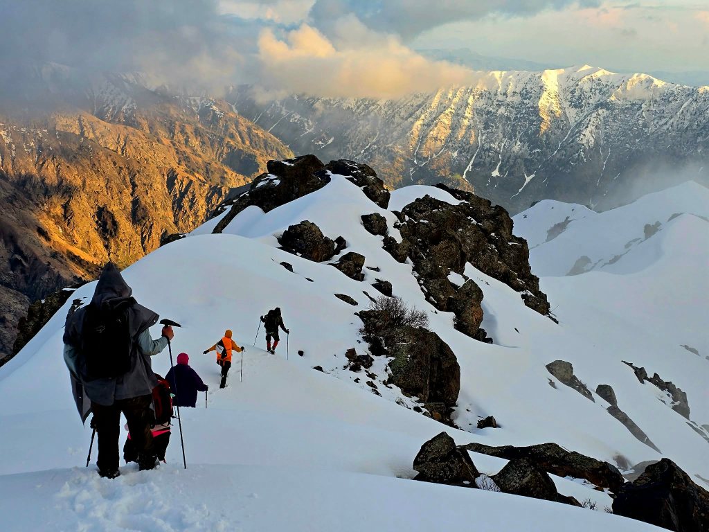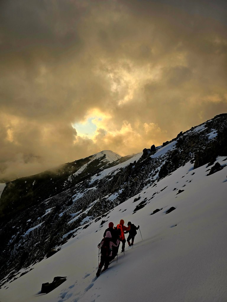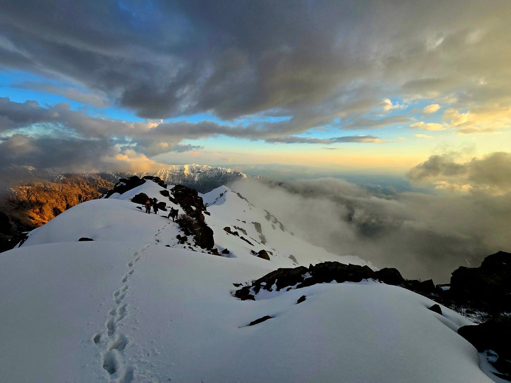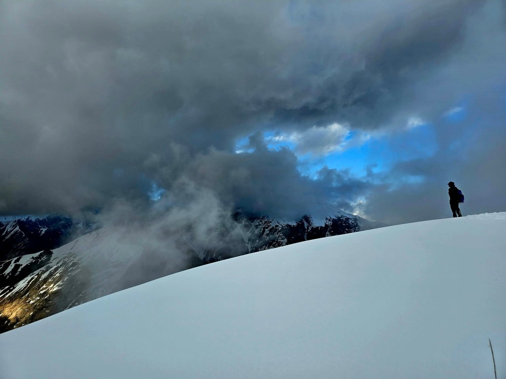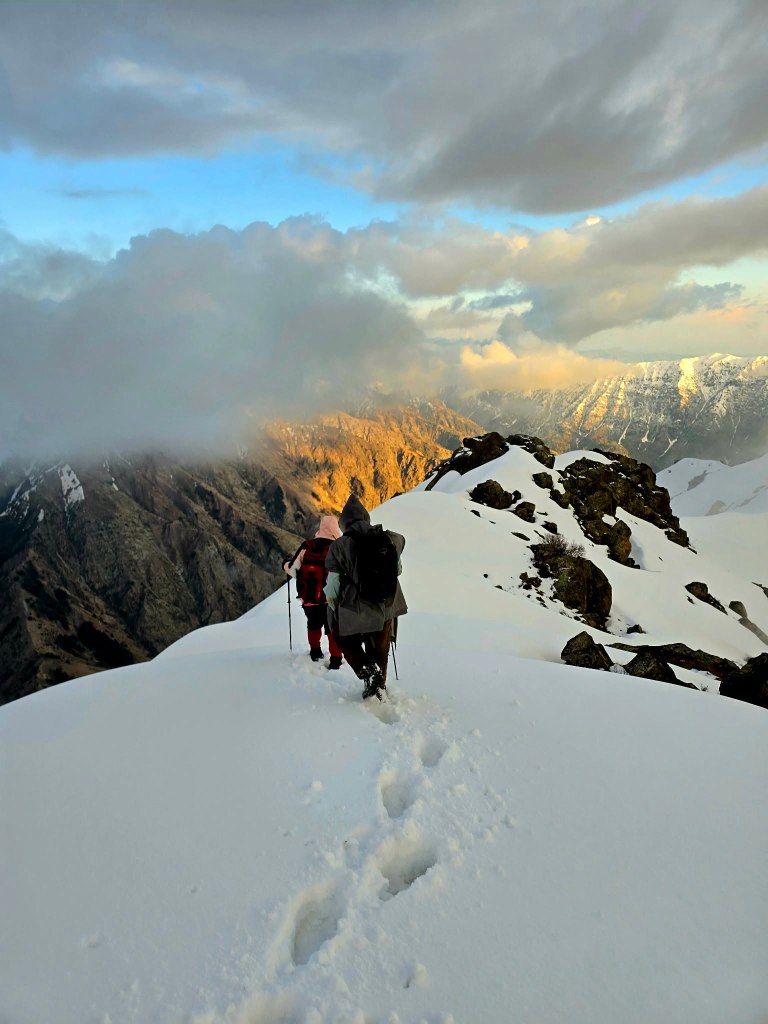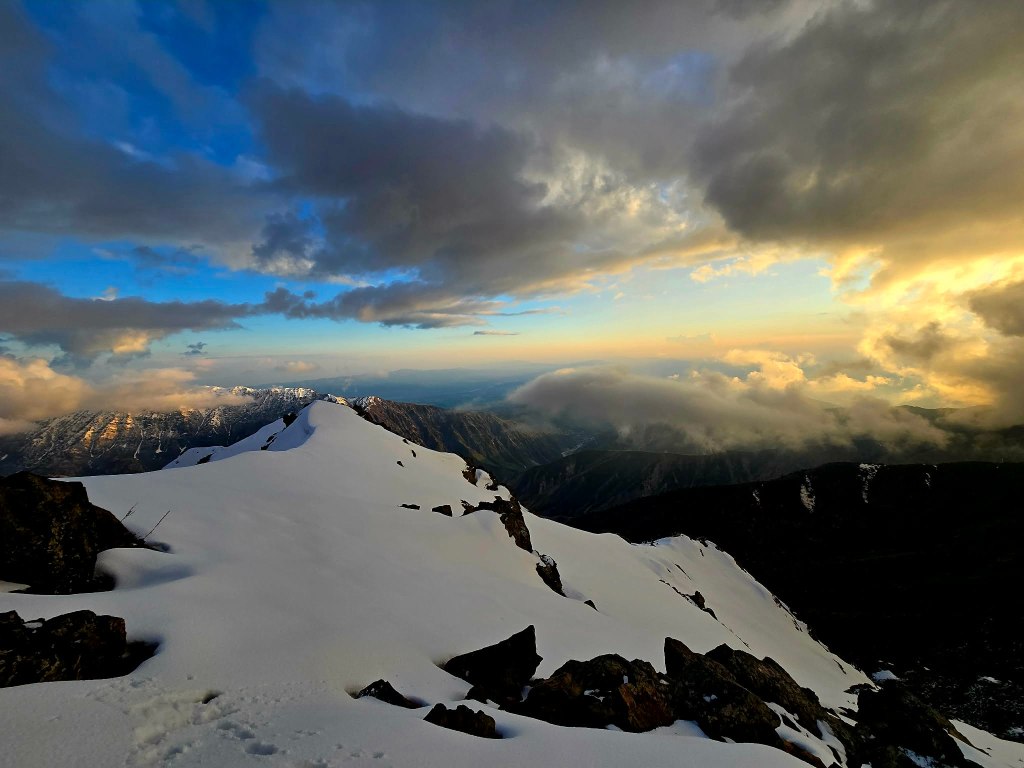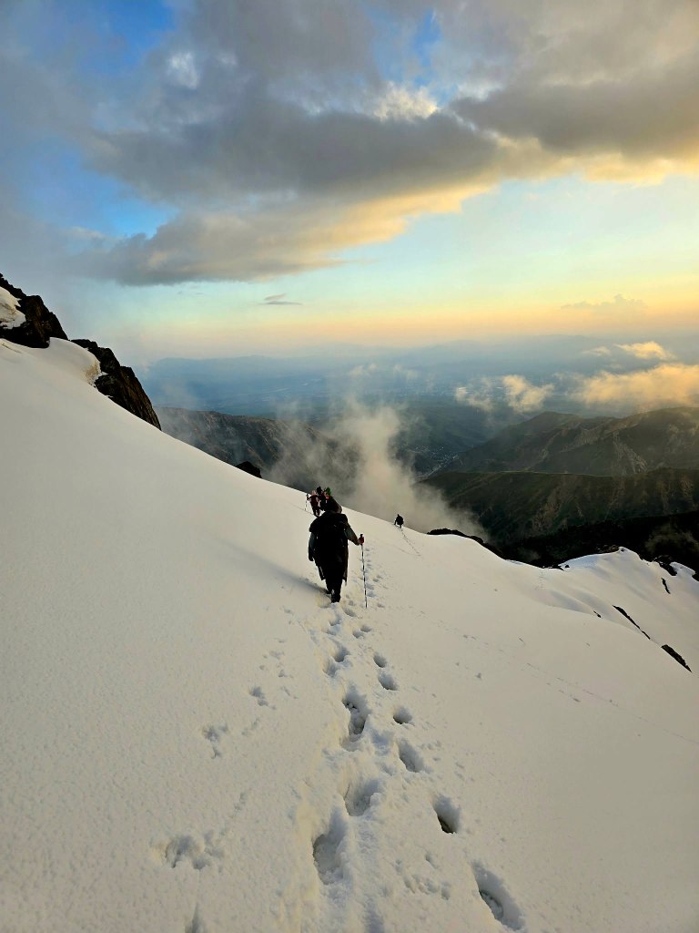 The first part of the descent was unreal—views stretching down into the Dara valley, the sky burning through sunset, and that quiet feeling that comes after a summit. But the light faded quickly. At the snowline, we stopped to switch gear—gaiters off, headlamps on.