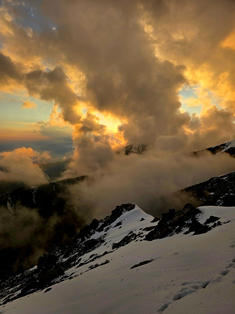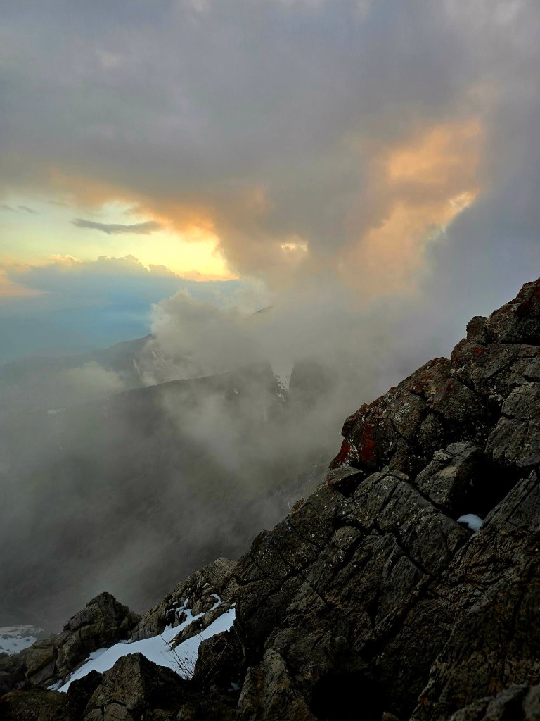 We dropped packs, layered up, and laid out what was left of our food on a makeshift “tablecloth.” For about 40 minutes, the mountain put on a show. Clouds drifted below us and at eye level, catching the light of the setting sun. Entire sections of the landscape would ignite for a moment before fading back into shadow. It was one of those rare windows where everything comes together.