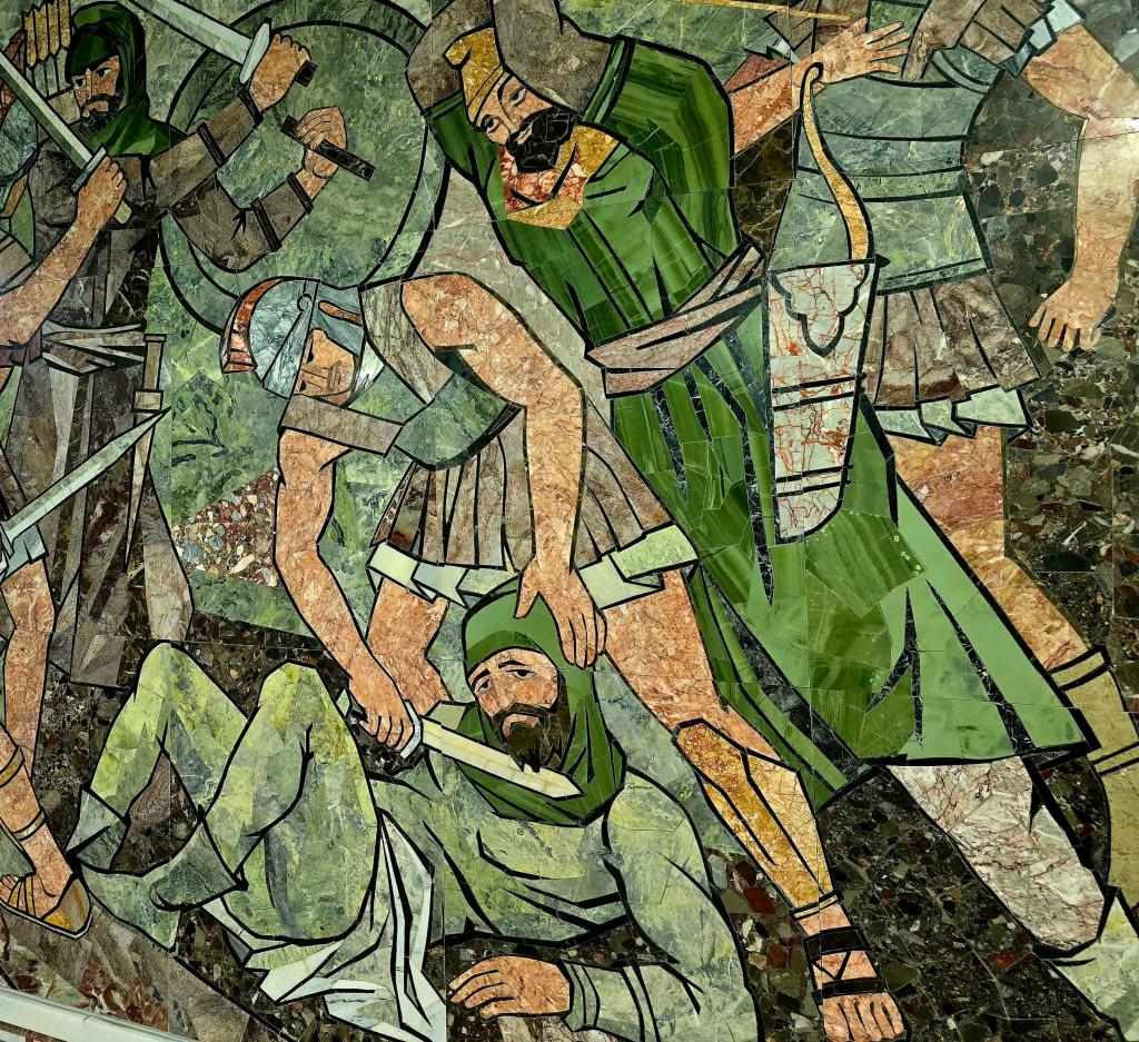 After wandering the bazaar for a while, we hit the streets again with a different kind of mission—tracking down the old Lenin statue that once stood in the center of town back when the city was still called Leninabad. We crossed the long bridge over the river and found ourselves in a park climbing up the side of a hill, long mosaic panels stretching upward and telling bits and pieces of the city’s story along the way.