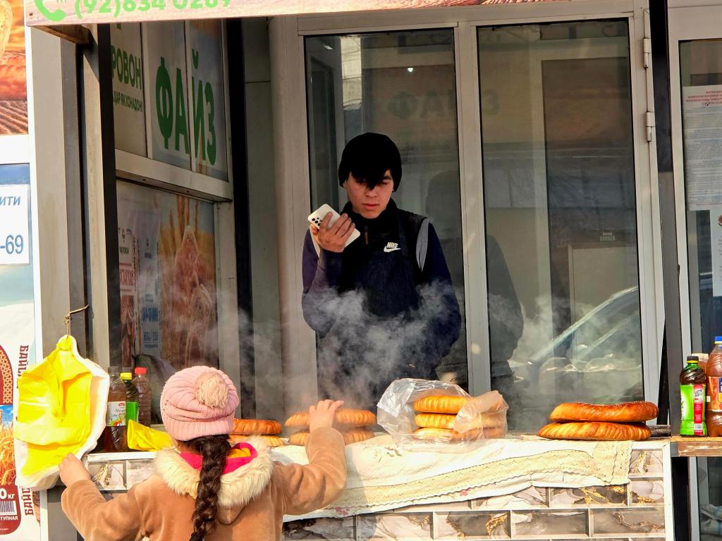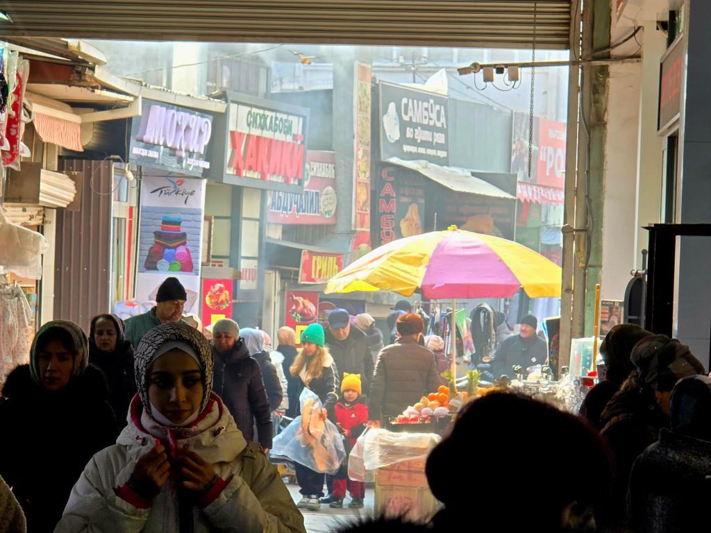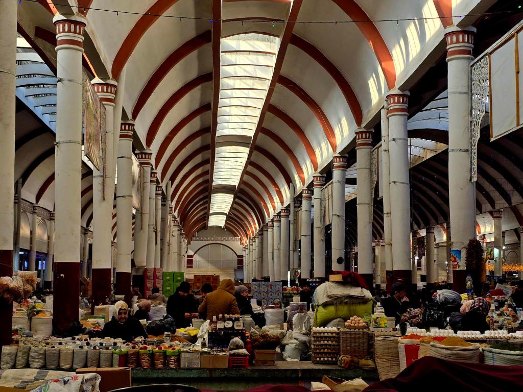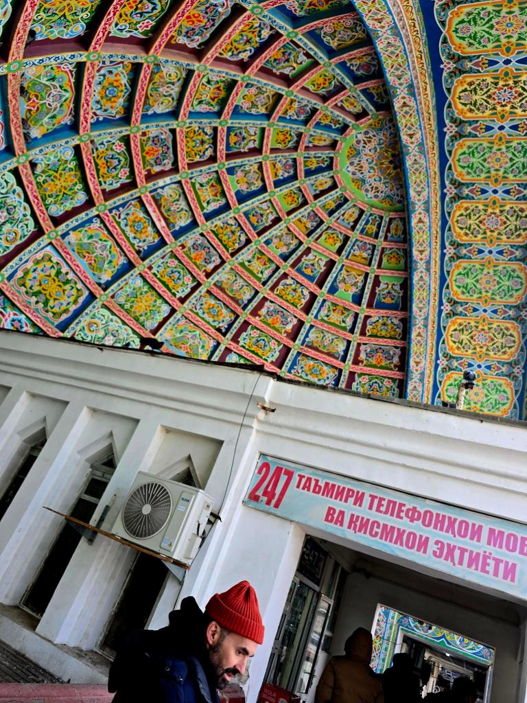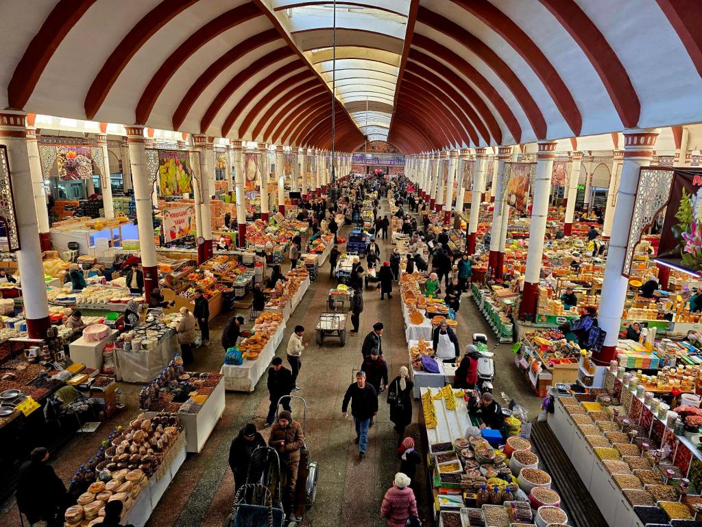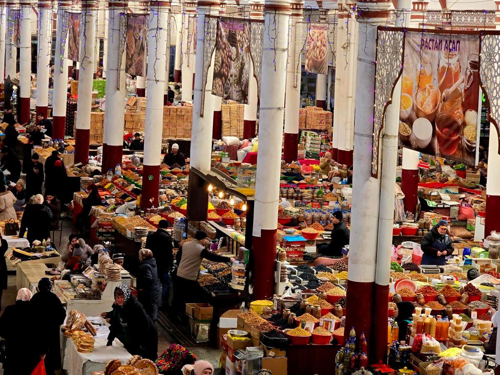 You still feel that most clearly at the Panjshanbe Bazaar. We made our way over mid-morning and stepped down into the open area out front just as the grills were hitting full stride. Smoke rolled across the square from long rows of шашлык already going, the smell catching you before you even saw the food. Inside, the place was alive. Vendors calling out, bread stacked high, spices laid out in bright rows. We found a small hole-in-the-wall spot serving plates by the gram, ducked in for some meat and a couple rounds of flatbread, and called it a win. The building itself is Soviet-era, but the trade happening inside it goes back centuries. That rhythm hasn’t changed much since caravans were passing through here loaded down with silk and ceramics.