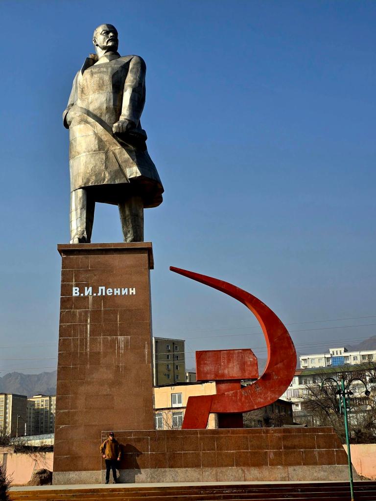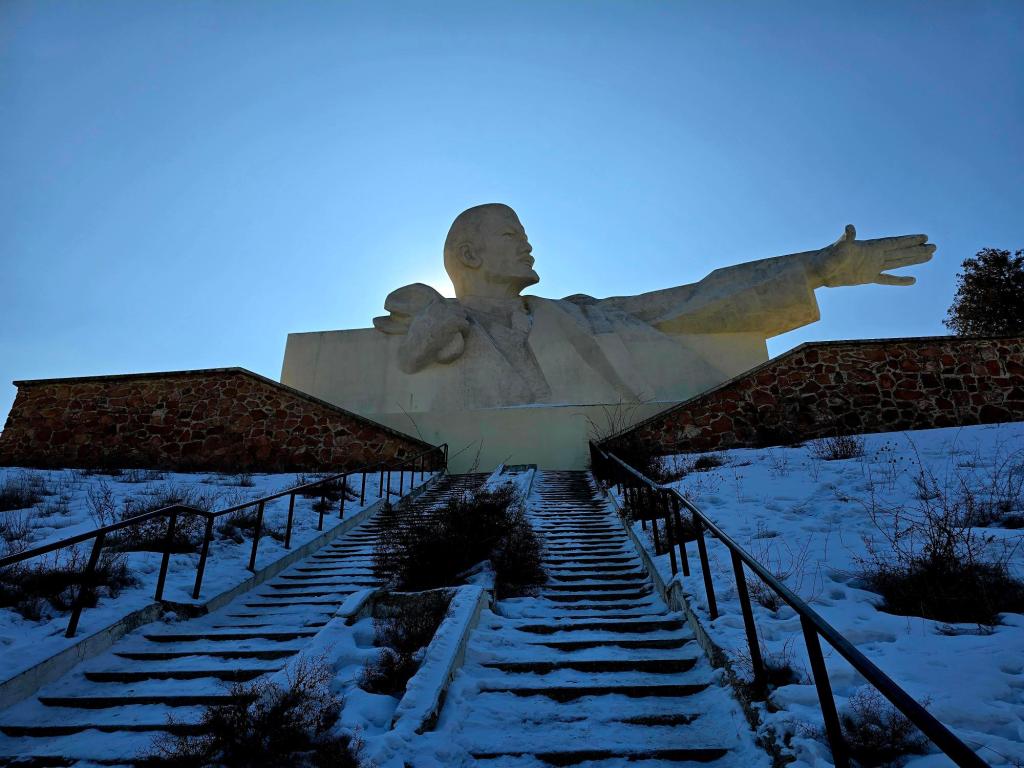 We left that afternoon and started the drive back toward Dushanbe, making one last stop along the way near Istaravshan at the massive Lenin Bust at Kattasoy Reservoir. This one is something else. A long staircase climbs straight up the hillside to a giant bust of Lenin set high above a reservoir, still pointing out toward the future, the water stretching out behind him. We climbed the steps, took it in for a minute, and then headed back down to the car to finish the drive through the mountains.